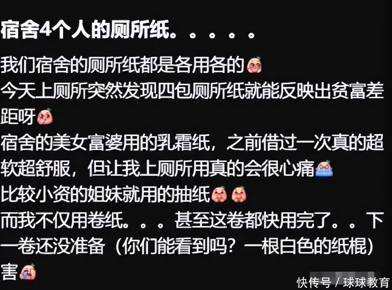 至少要比自己用的卷纸好许多,看着卫生间自己用到所剩无几的卷纸条,女同学内心复杂,忍不住感慨“看卫生纸,就知道我是穷人家的孩子”,一张随手拍下的女大学生宿舍对比照,背后的无奈是现实又心酸。
